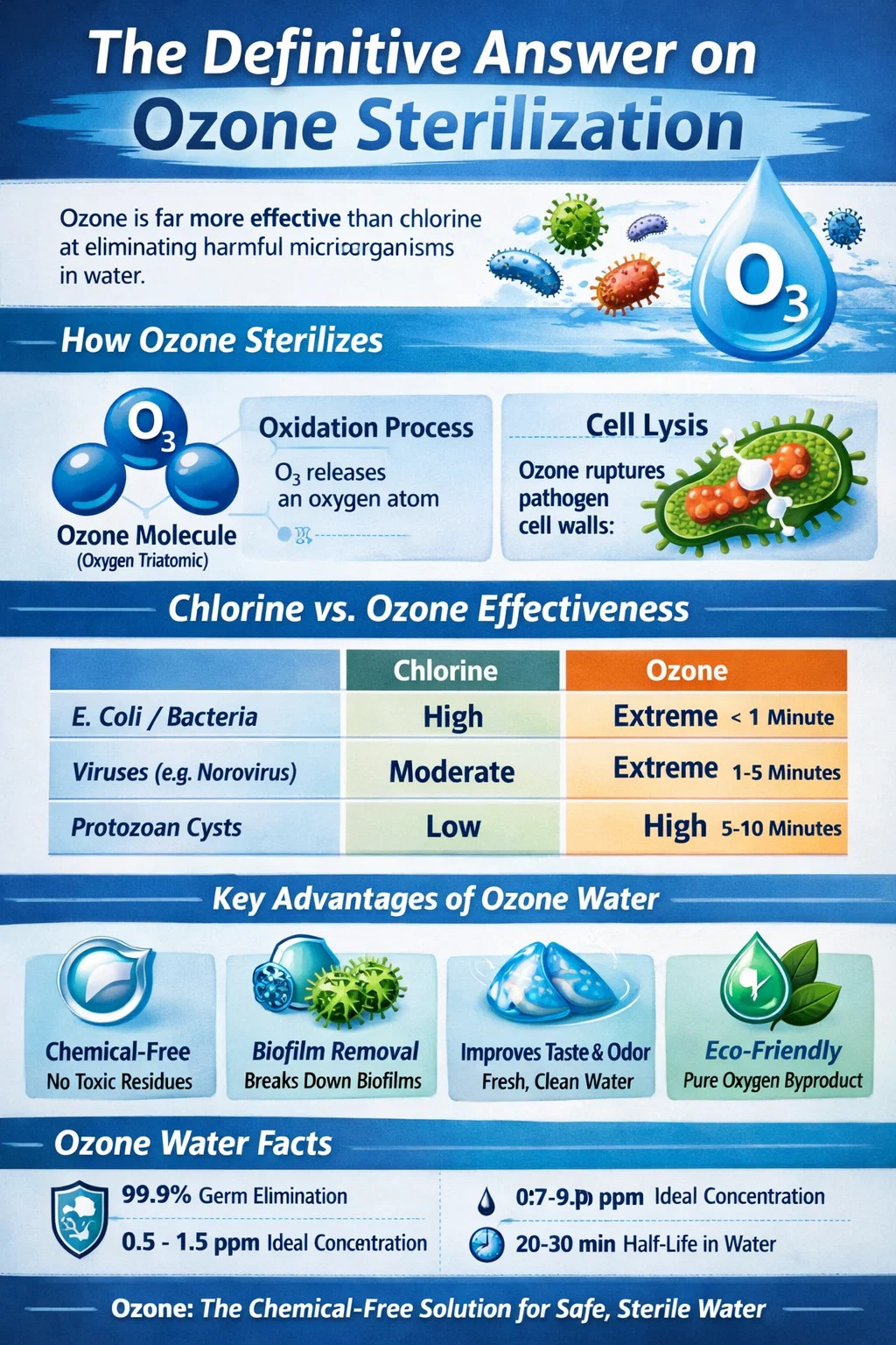 Tidak seperti bahan tambahan kimia, ozon mensterilkan melalui proses oksidasi molekul. Ini secara fisik menghancurkan dinding sel patogen, memastikan mereka tidak dapat mengembangkan resistensi. Setelah proses selesai, molekul ozon (O3) secara alami berubah kembali menjadi oksigen murni (O2), hanya menyisakan air bersih dan steril tanpa residu beracun.