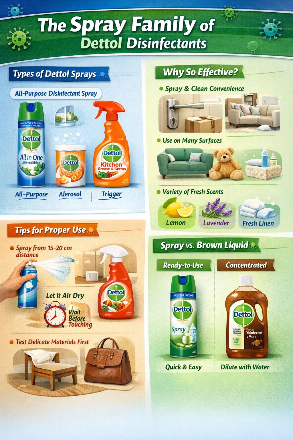 Dettol memang memiliki rangkaian produk semprotan disinfektan. Meskipun kebanyakan orang akrab dengan cairan disinfektan berwarna coklat, Dettol sebenarnya memiliki "keluarga semprotan" yang lengkap.