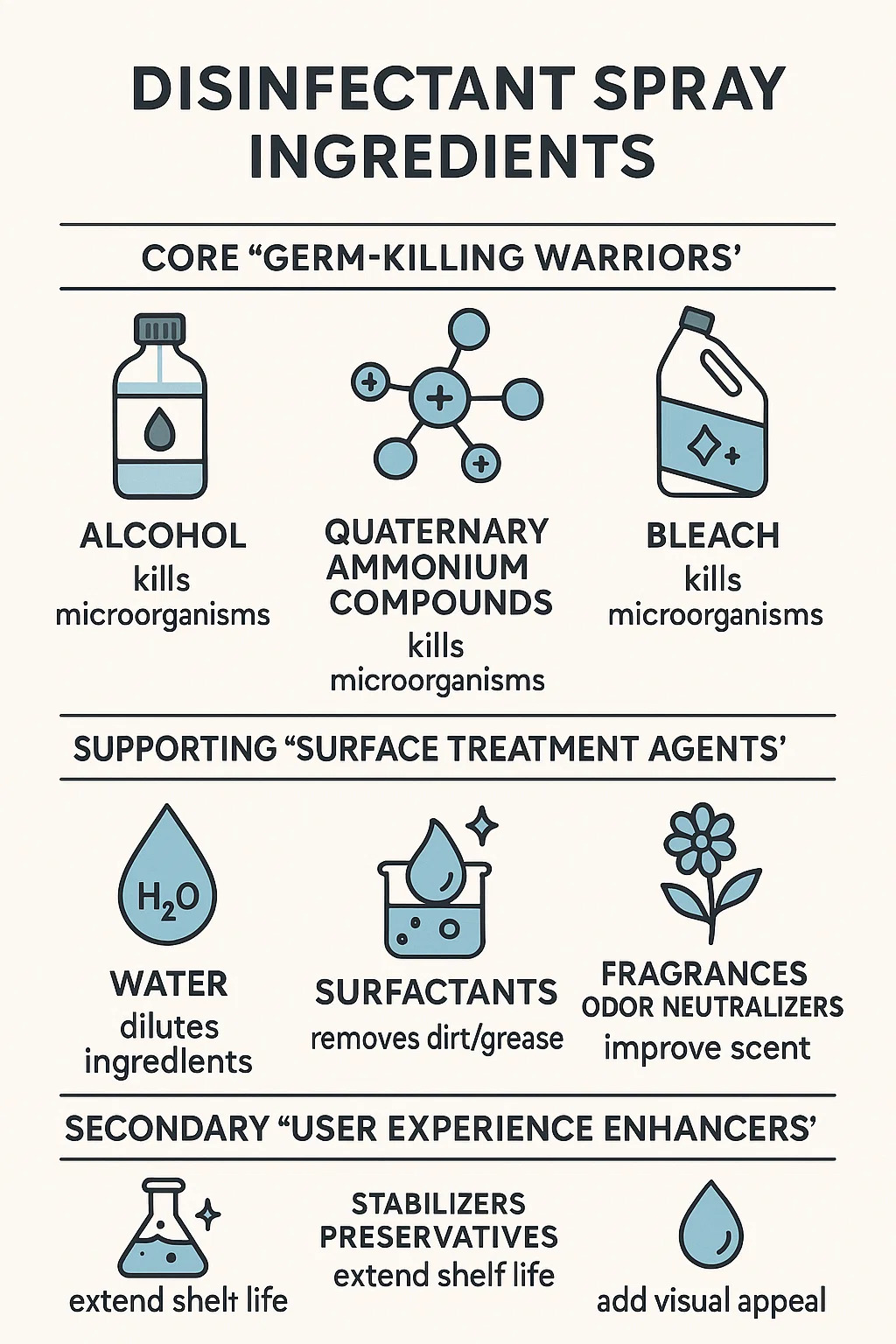 Untuk menciptakan yang efektif semprotan disinfektan , bahan "pahlawan" utama secara garis besar dapat dikategorikan sebagai berikut: